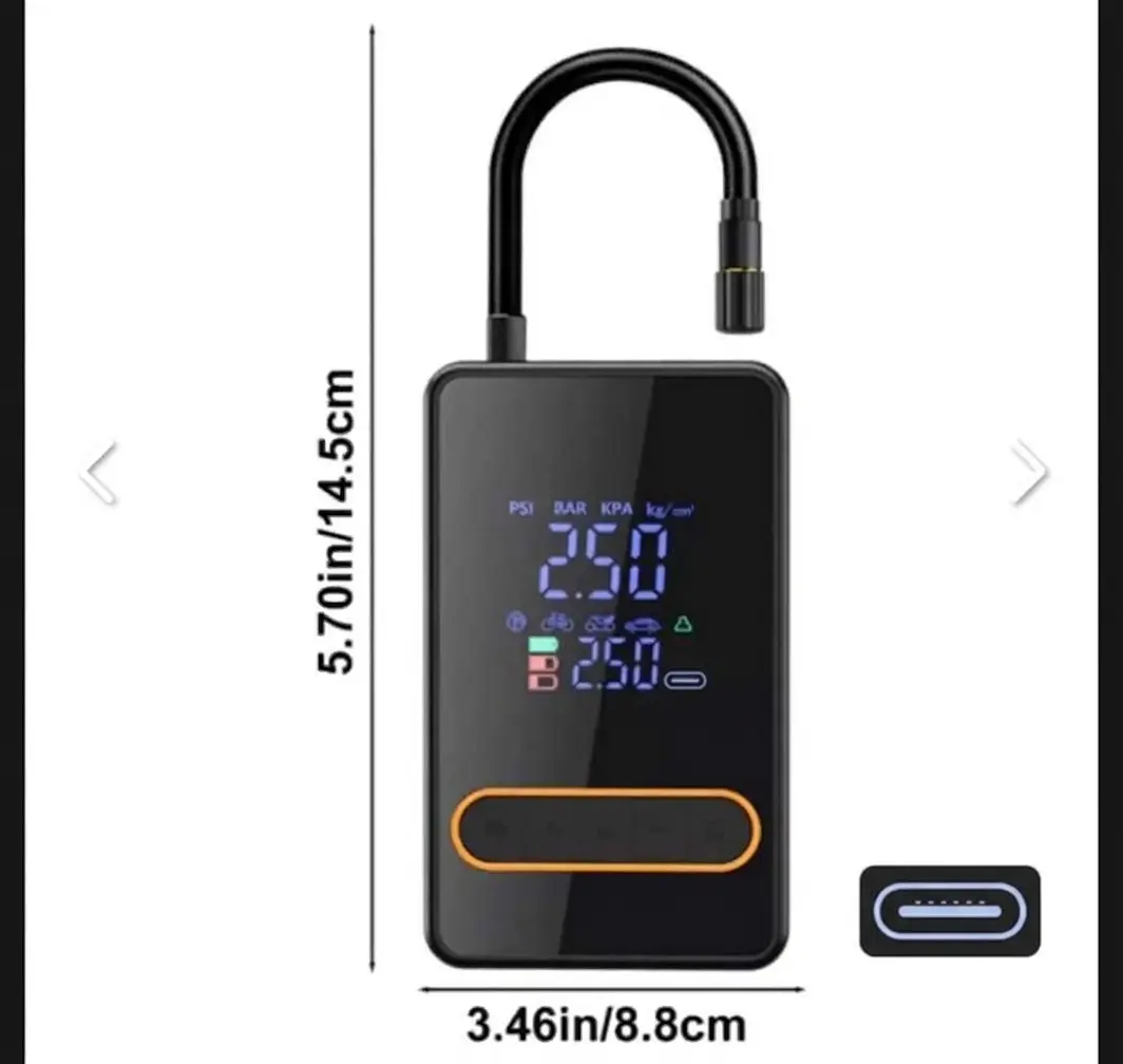 - Multifuncional: Más allá del inflado de neumáticos, nuestro producto es una potencia. Con un puerto de entrada USB-C y un puerto de salida USB-A, funciona como fuente de alimentación de emergencia para teléfonos móviles o dispositivos digitales.