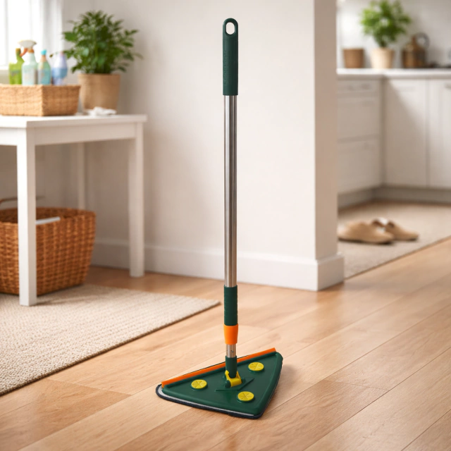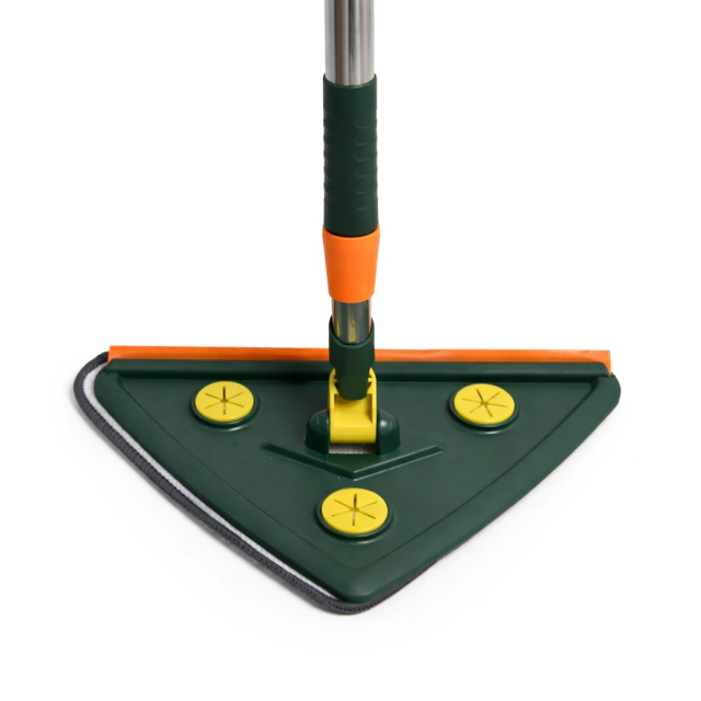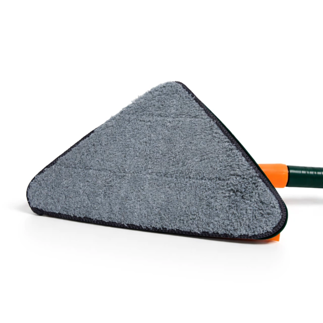Trapeador de limpieza triangular diseñado para una limpieza eficiente y profunda. Su cabezal con rotación de 360° permite llegar fácilmente a rincones, esquinas y zonas de difícil acceso, siendo ideal tanto para pisos como para techos.