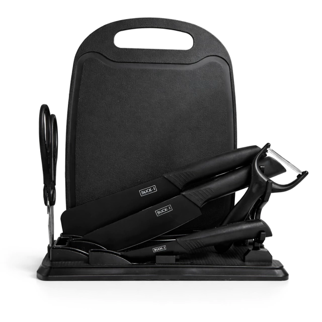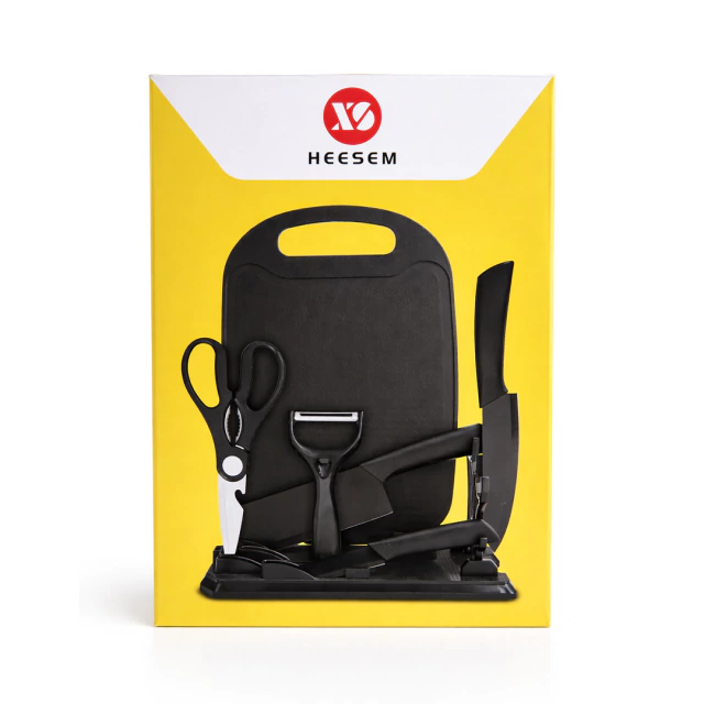 Incluye: 3 cuchillos, tijera, pelador y tabla