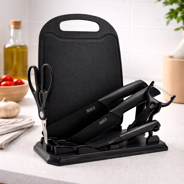 Equipá tu cocina con este completo set de cuchillos, tijera, pelador y tabla, ideal para facilitar la preparación diaria de tus comidas. El conjunto incluye tres cuchillos de acero inoxidable de distintos tamaños y usos, perfectos para cortar, picar y rebanar con precisión, además de una tijera multiuso práctica y funcional.